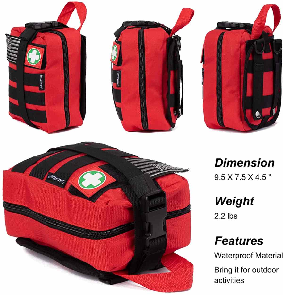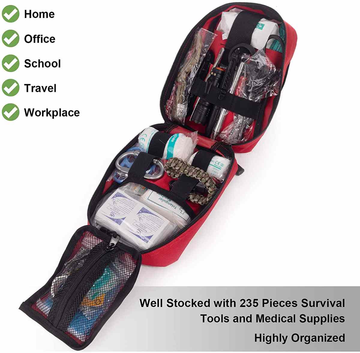 Toepassing van multifunctionele EHBO-overlevingsuitrusting voor op de camping: Dit is een professionele EHBO-kit van hoog niveau, geschikt voor auto, boot, fiets, motorfiets, huis, werkplek, reizen, jagen, kamperen, wandelen, vissen, varen, fietsen , backpacken, klimmen, mountainbiken, buitensporten, avonturen in de wildernis, om aan alle medische of noodbehoeften te voldoen.